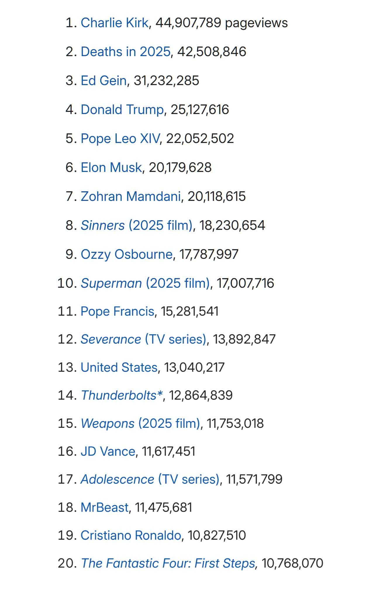 In a nutshell: Wikipedia has released its 11th annual list of the most-read articles throughout the year. In 2025, people spent an estimated 2.4 billion hours reading English Wikipedia articles. The most popular entry? Charlie Kirk's page.