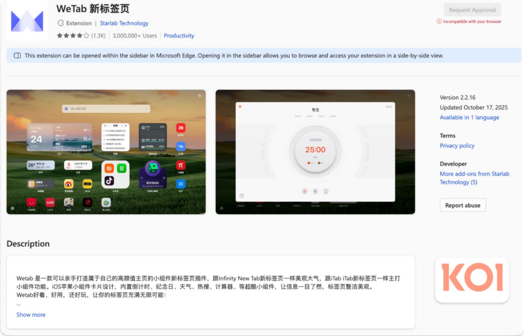 The second operation includes five additional extensions, such as a tab management add-on called WeTab, which has more than three million installs. Collectively, these extensions have over four million users worldwide. Unlike Clean Master and the other extensions in the first operation, all five add-ons in this network are still live on the Microsoft Edge Add-ons website.