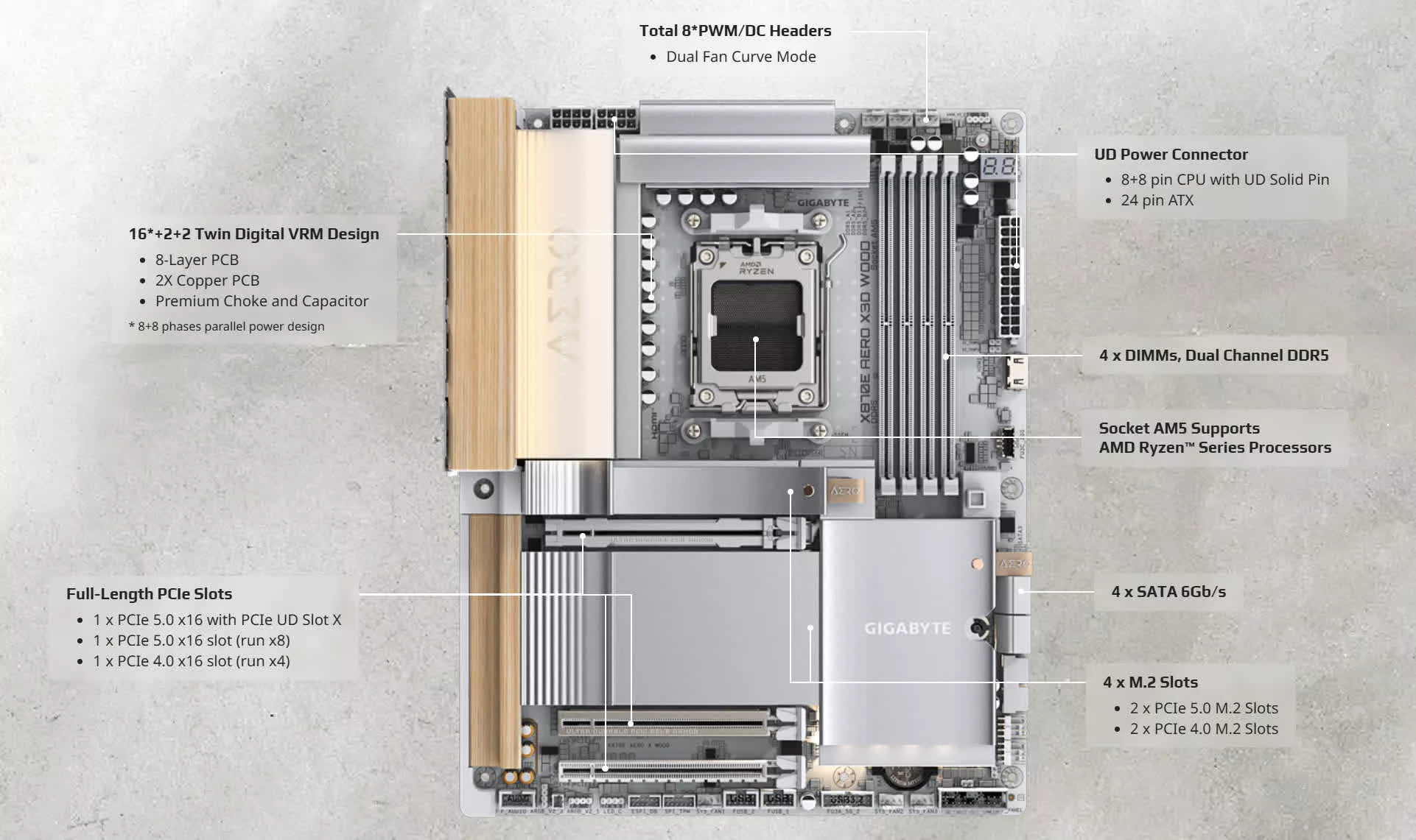 Besides the unusual natural touch, the X870E Aero X3D Wood motherboard should pack enough power and hardware features to satisfy the needs of a high-end PC system. Based on AMD's AM5 platform, the board supports Ryzen CPUs in the 7000, 8000, and 9000 Series. Hardware specs include two PCIe 5.0 slots for a potential dual-GPU configuration, four M.2 slots with PCIe 5.0/4.0 x4 support, dual 5GbE LAN ports, Wi-Fi 7, and more.