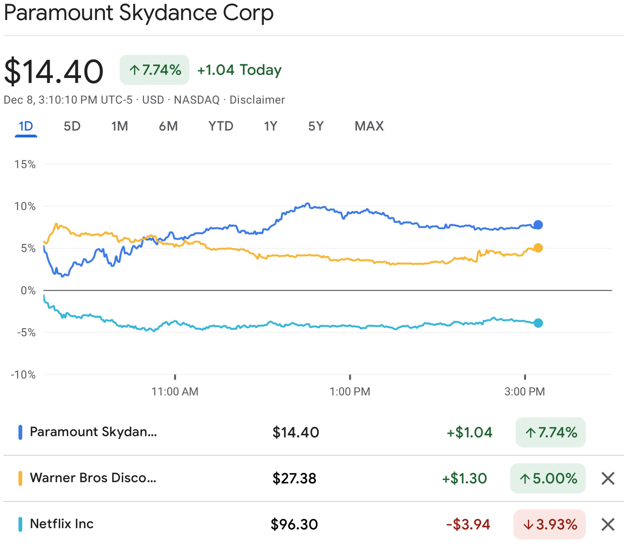 Paramount is offering shareholders an all-cash, $30-per-share deal that values Warner Bros. Discovery at $108.4 billion. The bid matches the proposal the WBD board rejected last week and is backed by equity from the Ellison family and RedBird Capital, along with $54 billion in debt financing from major banks. Early trading reflected the renewed battle: Paramount shares rose, Warner Bros. Discovery climbed, and Netflix fell.
