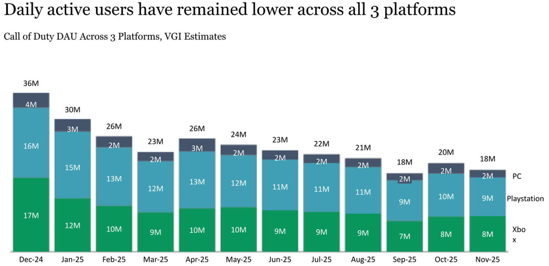 The data further suggests that the number of daily active players across the overall CoD franchise on PC, PlayStation, and Xbox fell to 18 million last month, a 50 percent decline from the 36 million recorded by Black Ops 6 in December 2024.